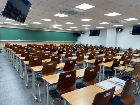서울 대치동의 대형 입시 학원의 강의실. / 서울 대치동의 대형 입시 학원에서 운영하는 자습전용관 자습시간표.