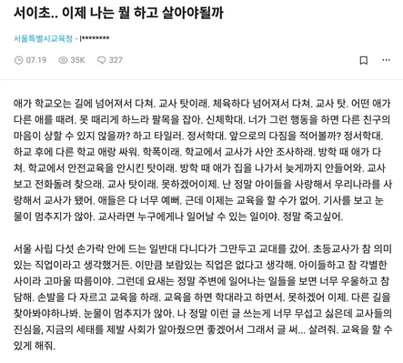 서울 서이초등학교 정문. / 커뮤니티 ‘블라인드'에 업로드 된 서울시교육청 소속 교사의 글.